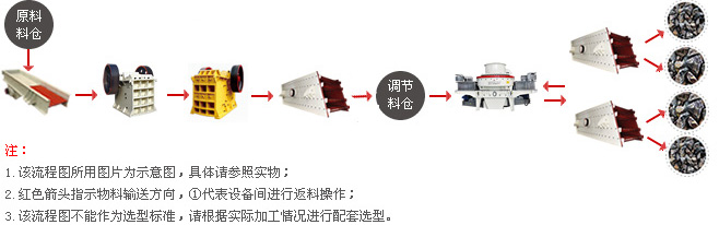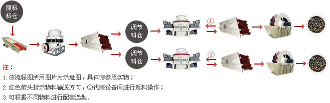 【所用设备】:GZD1100×4200振动给料机一台、PE750×1060深腔颚式破碎机一台、PFW1315欧版反击式破碎机一台、CS高效圆锥破碎机一台、3YZS2160圆振动筛两台、5X1145制砂机一台