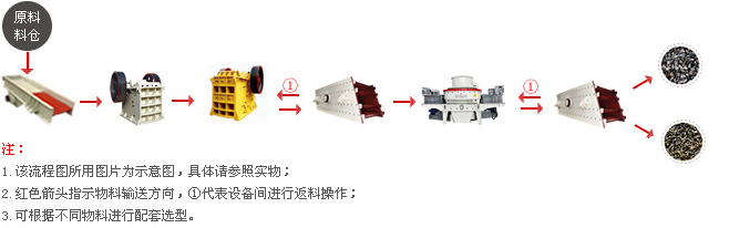 【所用设备】:GZD1300×4900一台、PE900×1200深腔颚式破碎机一台、反击式破碎机两台、3YZS2460震动给料机一台、5X1145制砂机一台、3YZS2460两台